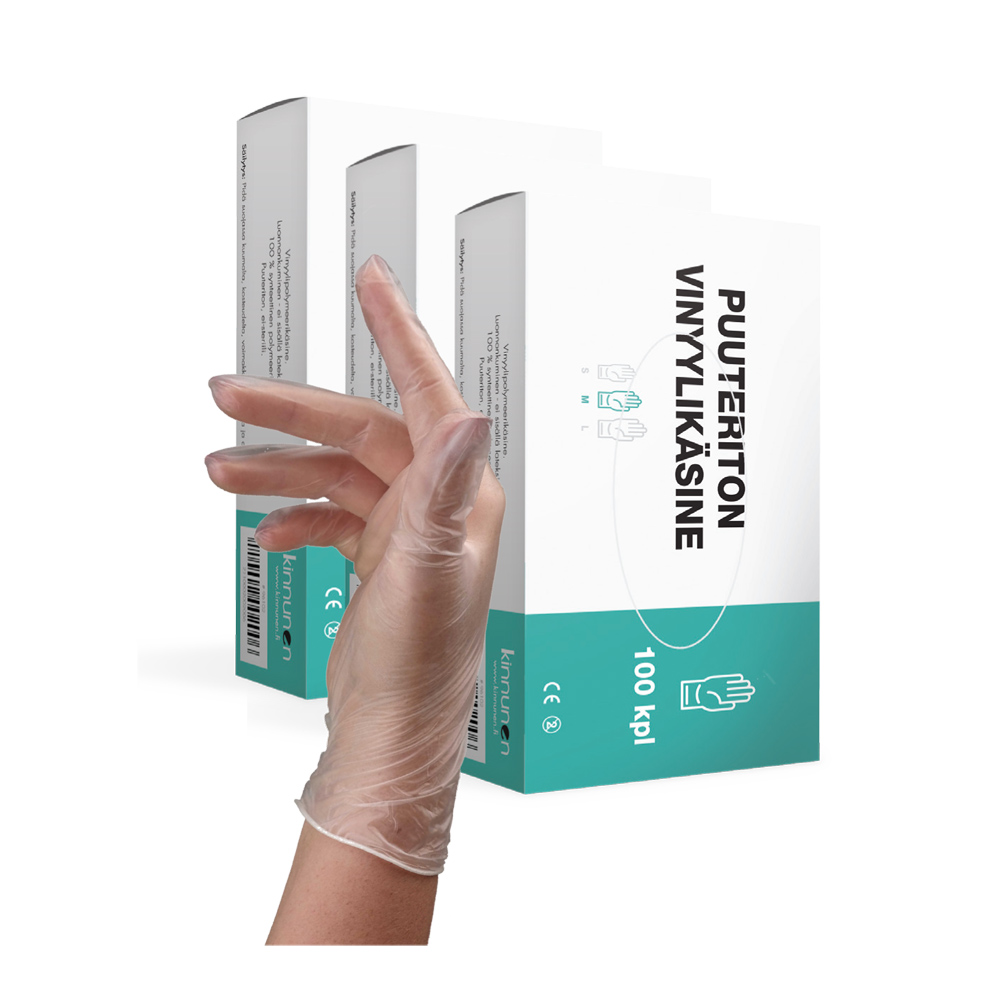 Puuteroimattomat vinyylikäsineet. Rullareuna helpottaa pukemista ja estää käsinettä rullautumasta alas. Hyvin suojaava, elastinen, laadukas ja kestävä vinyylihanska. Pakkauksessa 100 kpl.